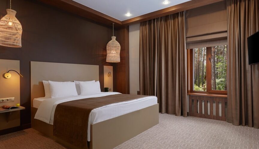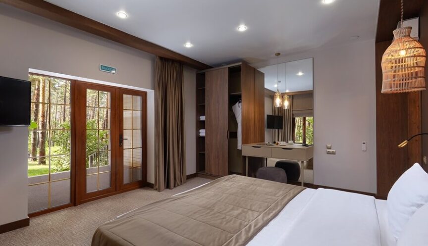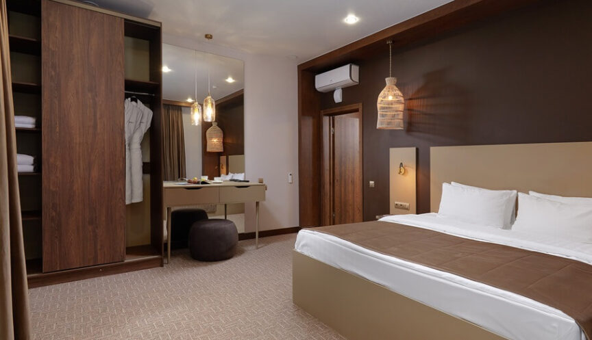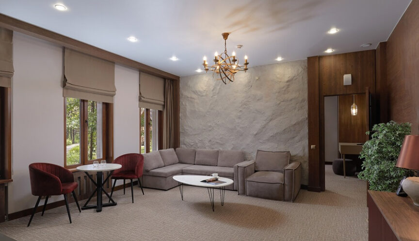 Двухкомнатный номер площадью 60 квадратных метров оборудован всем необходимым для комфортного проживания. В номере есть двуспальная кровать, диван, шкаф, вешалка, прикроватные тумбочки, стол и стулья. Установлены кондиционер и ЖК-телевизор, также есть электрочайник и чайный набор посуды. Номер оснащён камином, что создаёт уютную атмосферу. В санузле имеется душ, фен и туалетные принадлежности.